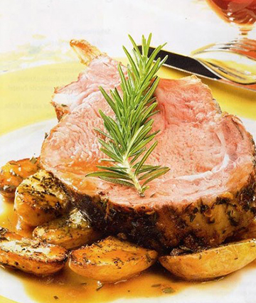 Thymian, Knoblauch, Zitronenschale, Pfefferkörner mit dem Olivenöl vermischen. Das Kotelett mit der Marinade einreiben und eine Stunde zugedeckt bei Raumtemperatur marinieren. Backofen auf 80 °C vorheizen. Ein Kuchengitter in ein Kuchenblech stellen. In einer Bratpfanne das Olivenöl erhitzen, das Fleisch rundherum anbraten. Fleisch auf das vorbereitete Kuchenblech legen und im vorgeheizten Ofen ca. 2 Stunden bis zu einer Kerntemperatur von 60 °C garen. Das Fleisch mit Meersalz bestreuen. Bei Küchentemperatur 10 Min. abstehen lassen. In der Zwischenzeitden Backofen auf 220 °C aufheizen. Vor dem Servieren das Kalbskotelett im Backofen 10 Min. wärmen. Das tranchierte Kalbskotelett mit Rosmarinjus und den Kartoffeln servieren.