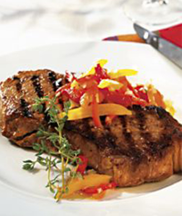 Alle Zutaten der Marinade verrühren, das Fleisch damit bestreichen und zugedeckt im Kühlschrank mindestens 1 Std. marinieren. Das Fleisch ca. 30 Min. vor dem Grillieren aus dem Kühlschrank nehmen. Kurz vor dem Grillieren die Marinade abstreifen und das Fleisch mit Salz würzen. Für die Peperonata die Peperoni gut abtropfen lassen und in feine Streifen schneiden. Die Zwiebel fein hacken. Die Thymianblättchen abstreifen. Alles in eine Schüssel geben, mit Olivenöl und Essig mischen und mit Salz und Pfeffer abschmecken. Das Fleisch auf jeder Seite ca. 1 Min. über starker Glut anbraten. Das Fleisch an den Rand schieben oder den Rost höher stellen und ca. 4–6 Min. fertig grillieren, bis der austretende Fleischsaft rosa ist. Die Entrecôtes dabei regelmässig wenden. Mit der Peperonata servieren und nach Belieben mit Thymianzweigen garnieren.