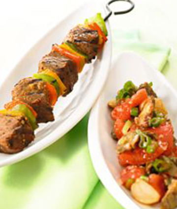 Das Lammfleisch in 2 cm grosse Würfel schneiden und in eine Schüssel geben. Die Zwiebel, Knoblauch, Paprika, Kreuzkümmel, Zitronenthymian, Zitronensaft und 2 Esslöffel Olivenöl zu den Lammwürfeln geben und kräftig mischen. Mindestens 2 Stunden marinieren, besser eine ganze Nacht. Danach das Fleisch abwechslungsweise mit den Peperoni auf die Holzspiesse stecken. Mit Salz und Pfeffer würzen. Backofen auf 240 °C Grill vorheizen. Ein Kuchenblech mit dem restlichen Olivenöl einfetten und die Spiesse darauf legen. Im vorgeheizten Ofen auf jeder Seite 4 Min. grillen und auf dem Gemüse anrichten.